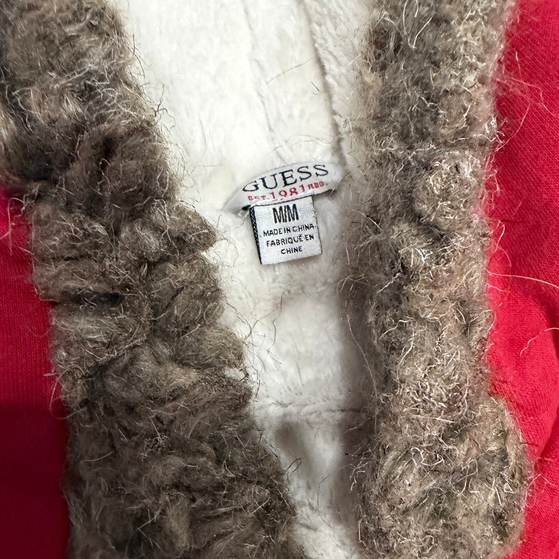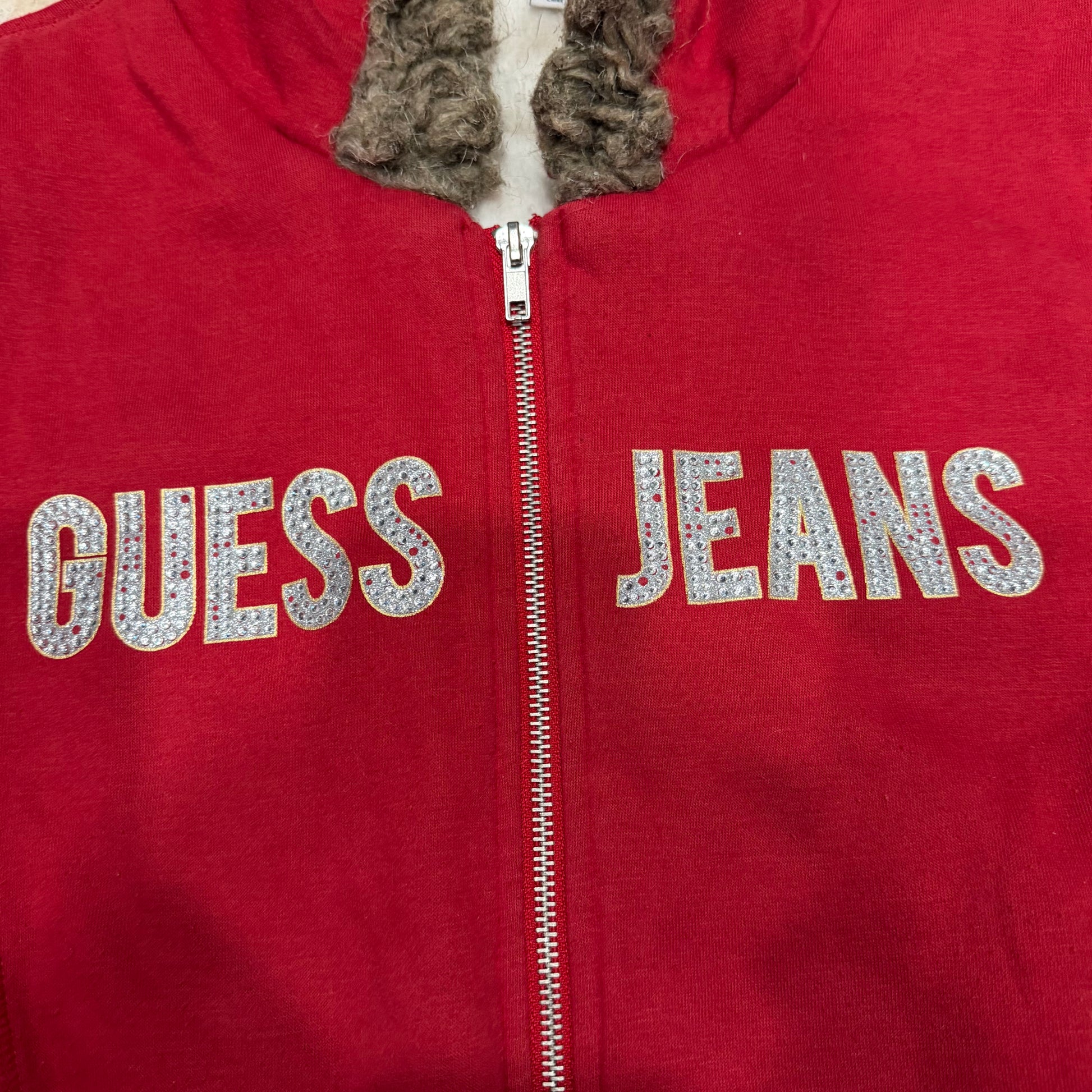 (M) early 2000s guess jeans fur hood red embellished red zip up jacket