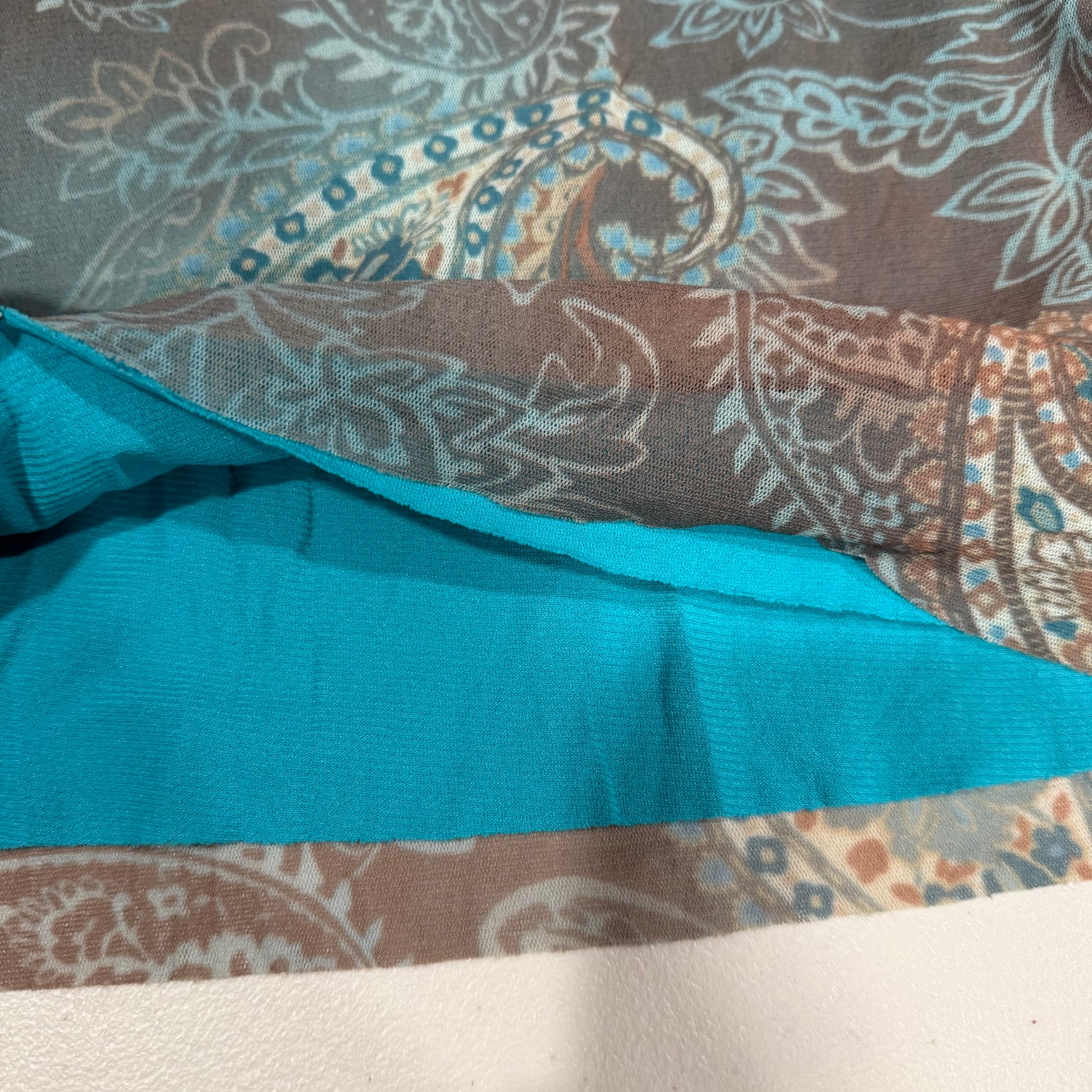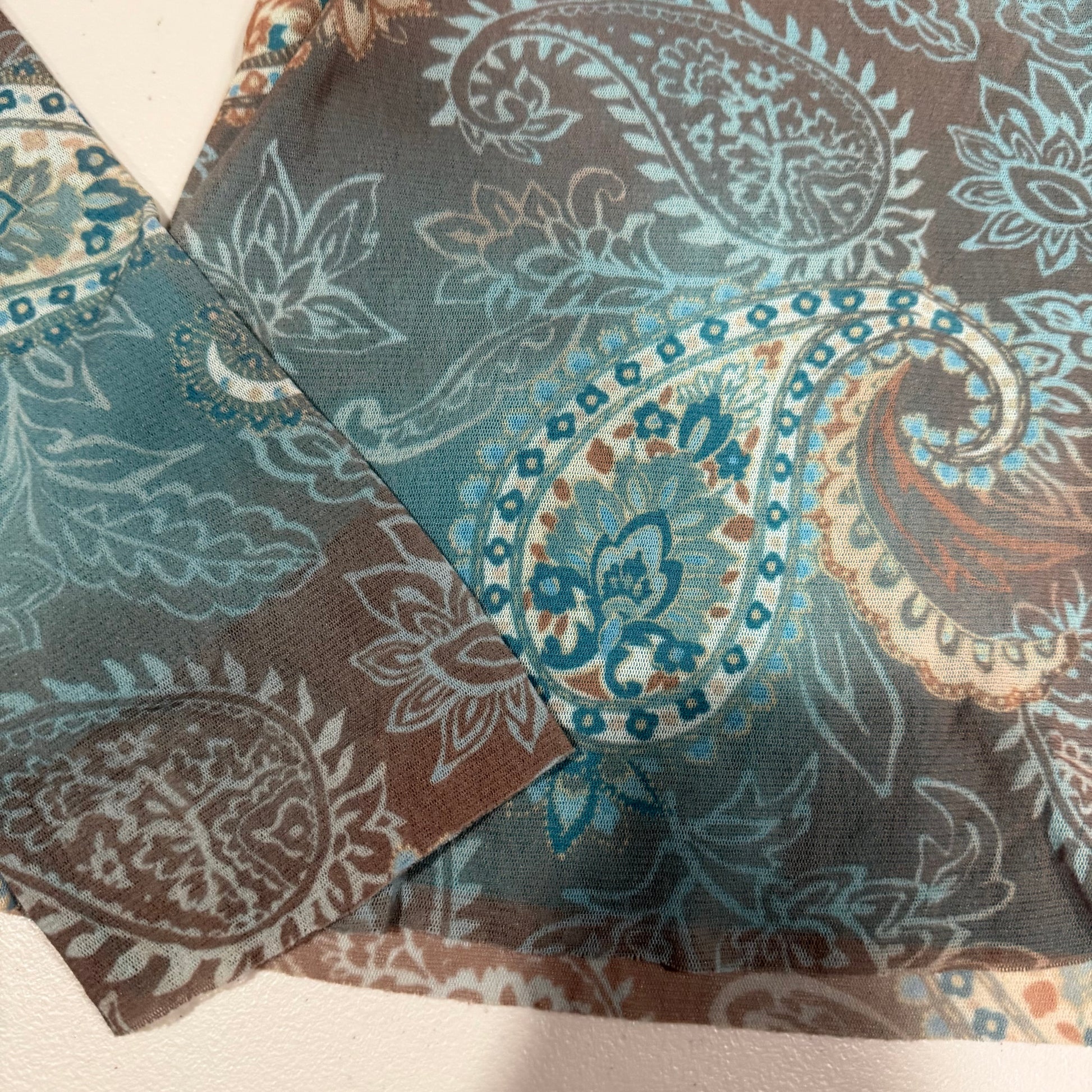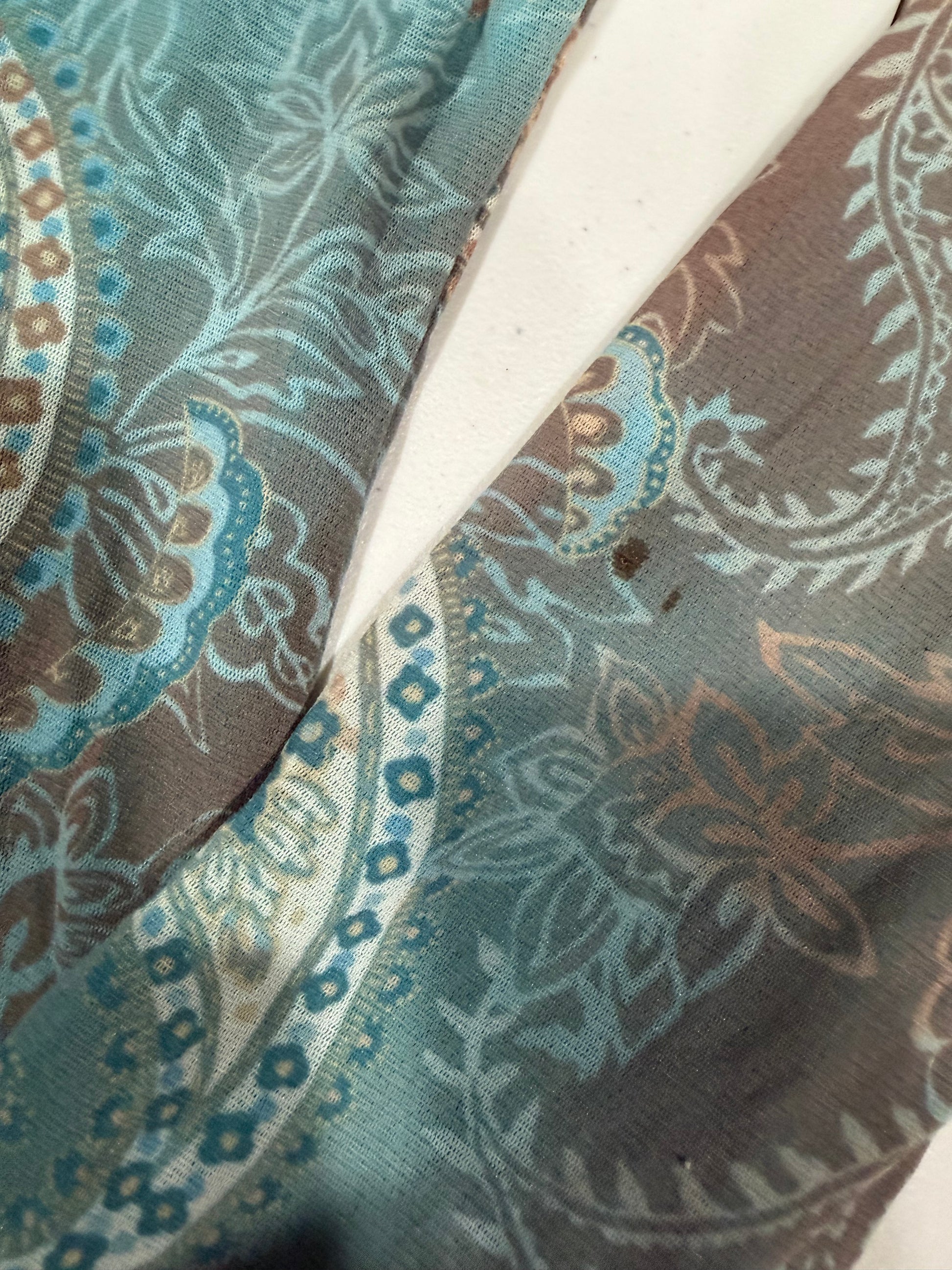 (M) vintage/y2k paisley print raw hem off the shoulder long sleeve top