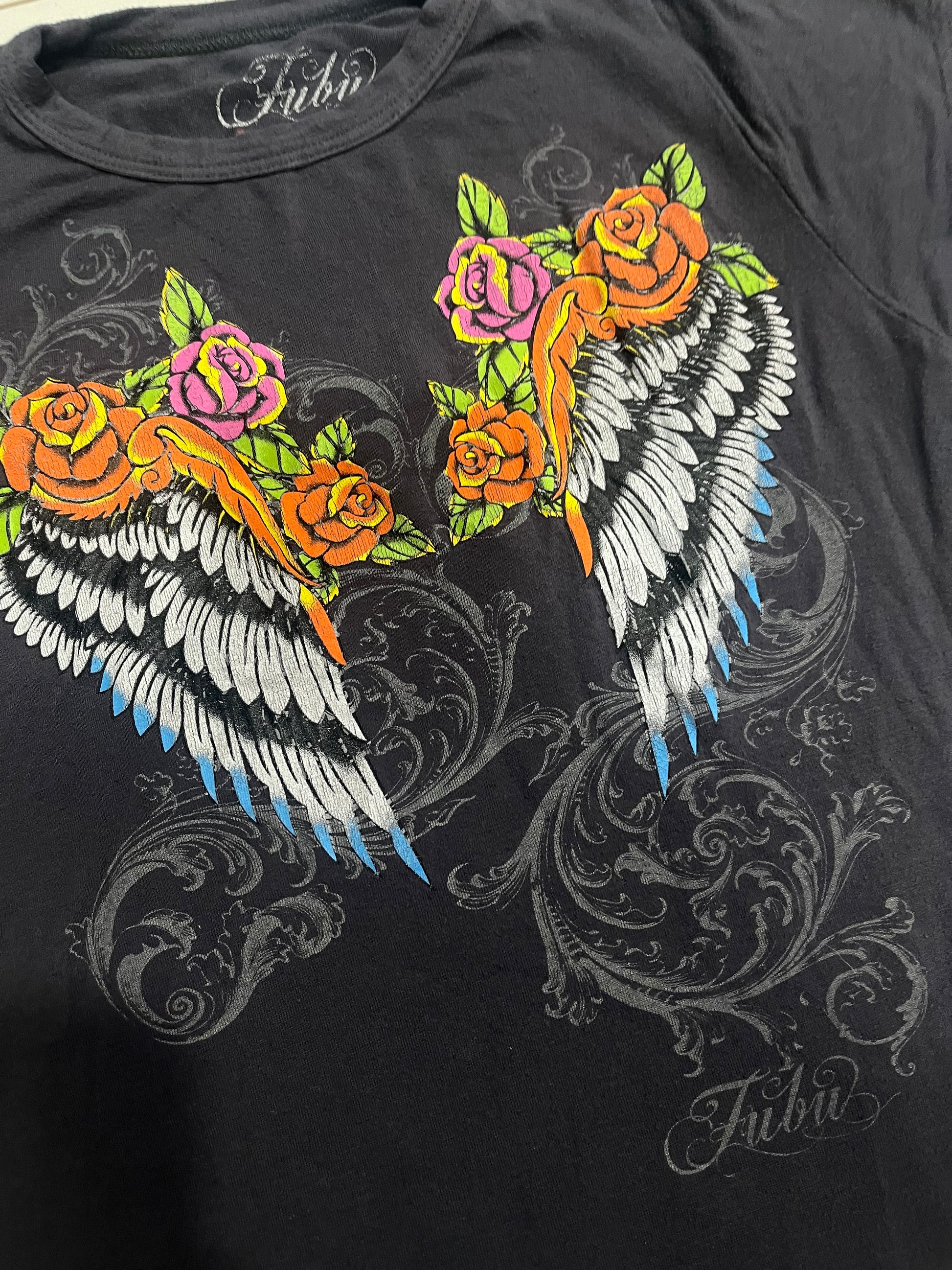 (XS) 2000s Angel Wing & Roses Fitted Graphic Top